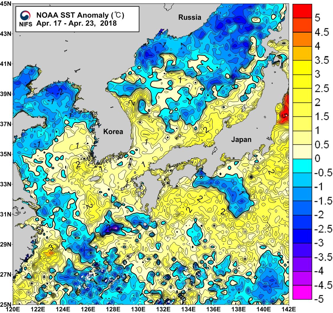 NOAA 위성영상 표면수온 평년편차 분포도 (2018. 04. 17 ~ 2018. 04. 23)