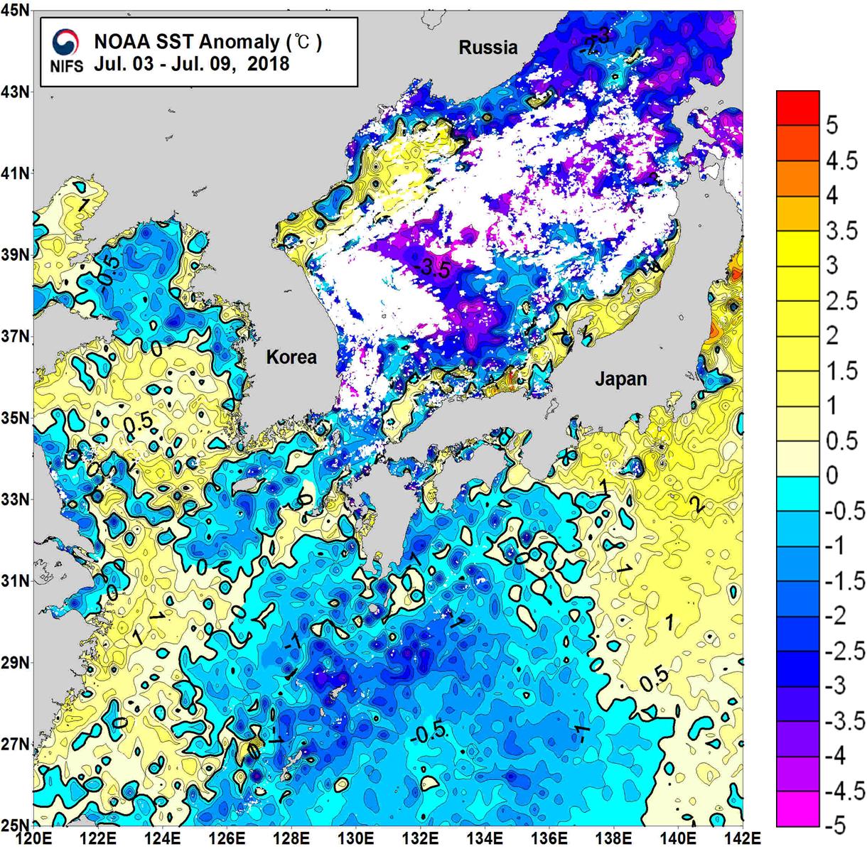 ○ 「평년에 비해」 대화퇴 근해 1도 낮게, 울릉도-독도 0.5도 높게, 대마도 0.5도 높게, 제주도 근해 0.5도 낮게, 이어도 근해 0.5도 낮게, 가거초 근해 비슷하게, 어청도 근해 1도 높게 나타날 것으로 예상됩니다. NOAA 위성영상 표면수온 평년편차 분포도 (2018. 07. 03 ~ 2018. 07. 09)