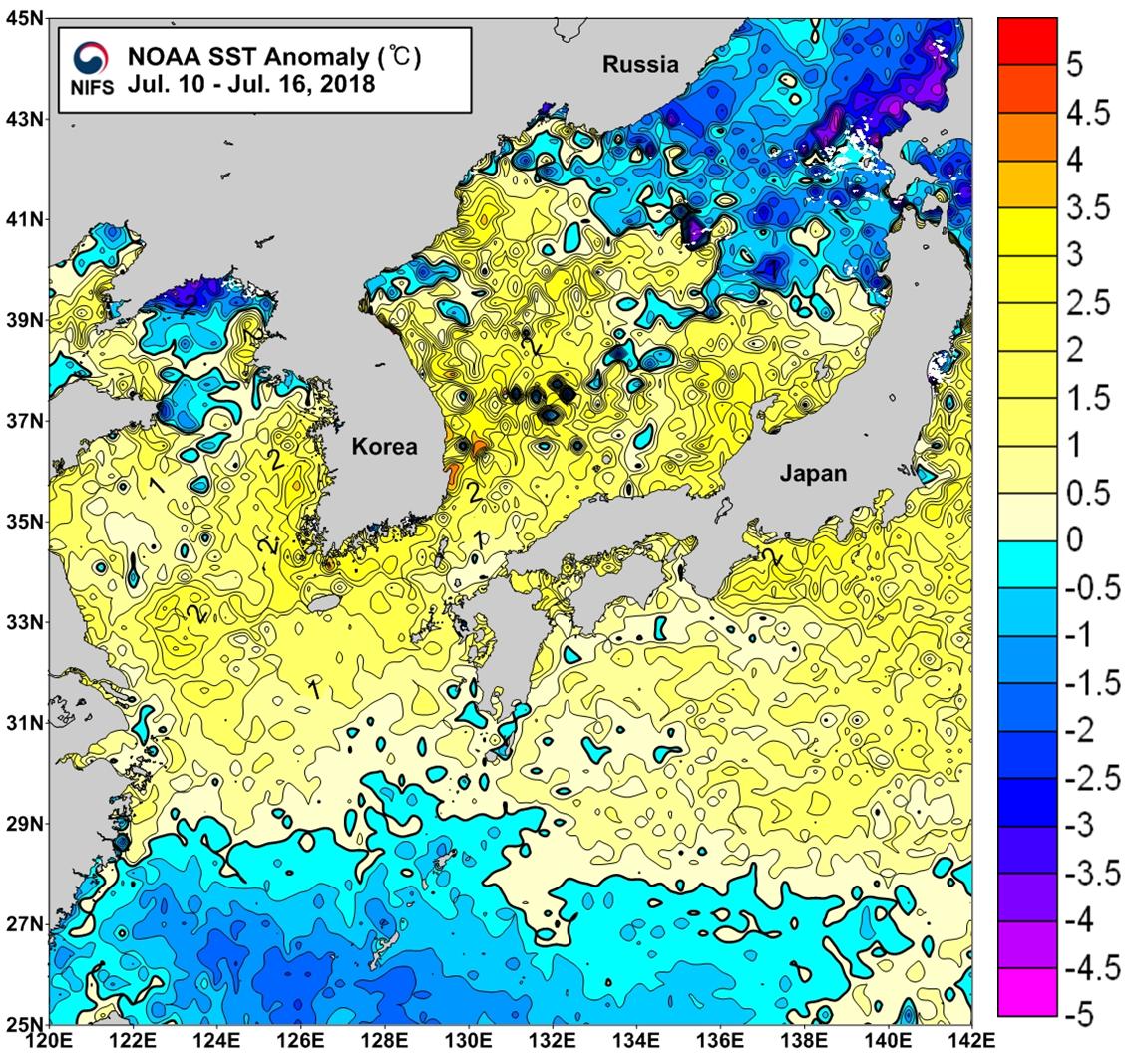 NOAA 위성영상 표면수온 평년편차 분포도 (2018. 07. 10 ~ 2018. 07. 16) ※ 위 그림은 NOAA 위성에서 관측한 한반도 주변해역 표면수온 영상의 평년(1990-2017년) 에 대한 편차 분포를 나타냅니다.