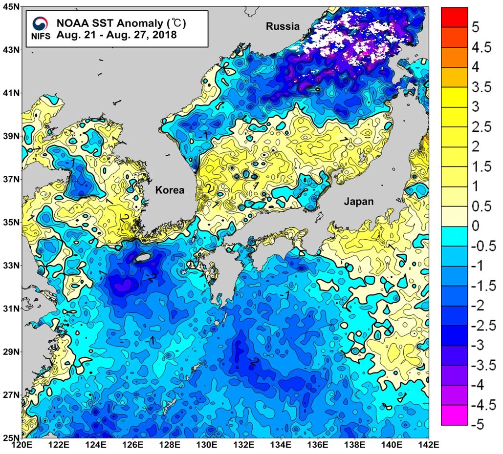 NOAA 위성영상 표면수온 평년편차 분포도 (2018. 08. 21 ~ 2018. 08. 27)