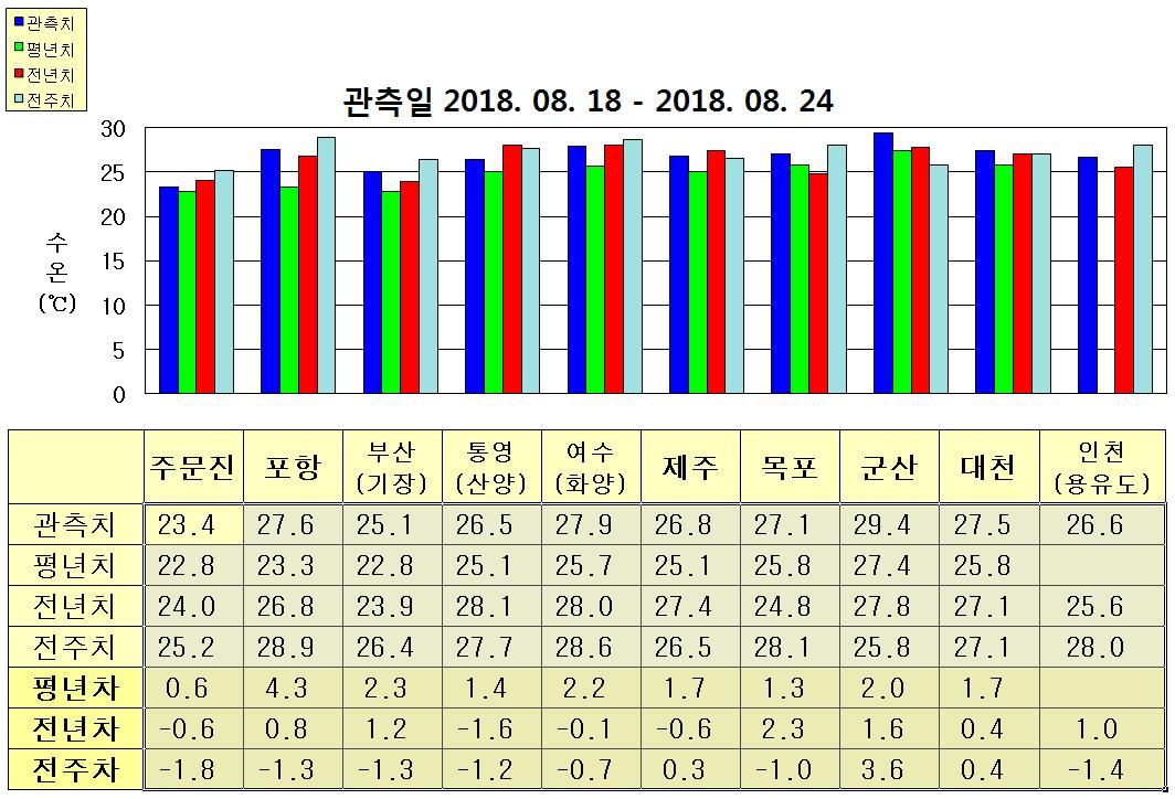 ○ 금주(2018.09.02~2018.09.08)의 한반도 연안 표면수온은 동해 연안역에서 섭씨 23.0~26.5도, 남해 연안역 25.5~26.5도, 서해 연안역에서 25.5~27.0도 내외로 예상됩니다. ○ 평년에 비해 동해 연안역은 1.0~3.5도 높게, 남해 연안역은 0.5~1.5도 높게, 서해 연안역은 1.5~2.0도 높게 나타날 것으로 예상됩니다. ○ 전년에 비해 포항 1.7도 높음을 제외한 동해 연안역은 비슷하게, 제주 0.5도 낮음을 제외한 남해 연안역은 0.5~1.5도 높게, 서해 연안역은 1.0~2.5도 높게 나타날 것으로 예상됩니다.