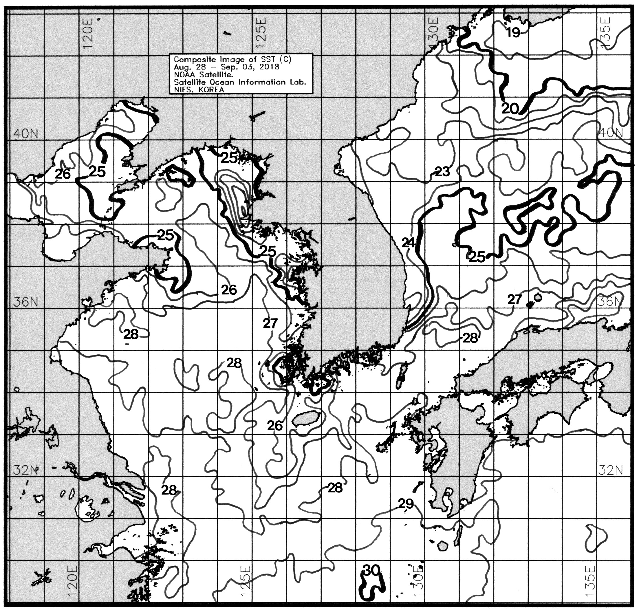 ○ 금주(2018.09.09~2018.09.15)의 한국근해 표면수온은 대화퇴 근해 섭씨 22~24도, 울릉도-독도 근해 24~25도, 대마도 근해 26~27도, 제주도 근해 23~25도, 이어도 근해 26~27도, 가거초 근해 26~27도, 어청도 근해 24~26도, 백령도 근해 23~24도 내외로 예상됩니다.