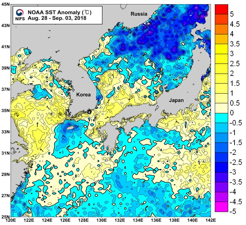 NOAA 위성영상 표면수온 평년편차 분포도 (2018. 08. 28 ~ 2018. 09. 03)
