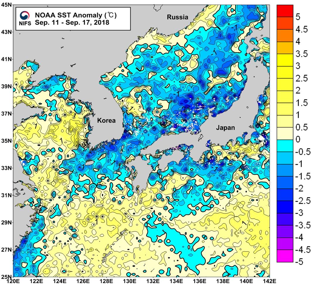 NOAA 위성영상 표면수온 평년편차 분포도 (2018. 09. 11 ~ 2018. 09. 17)