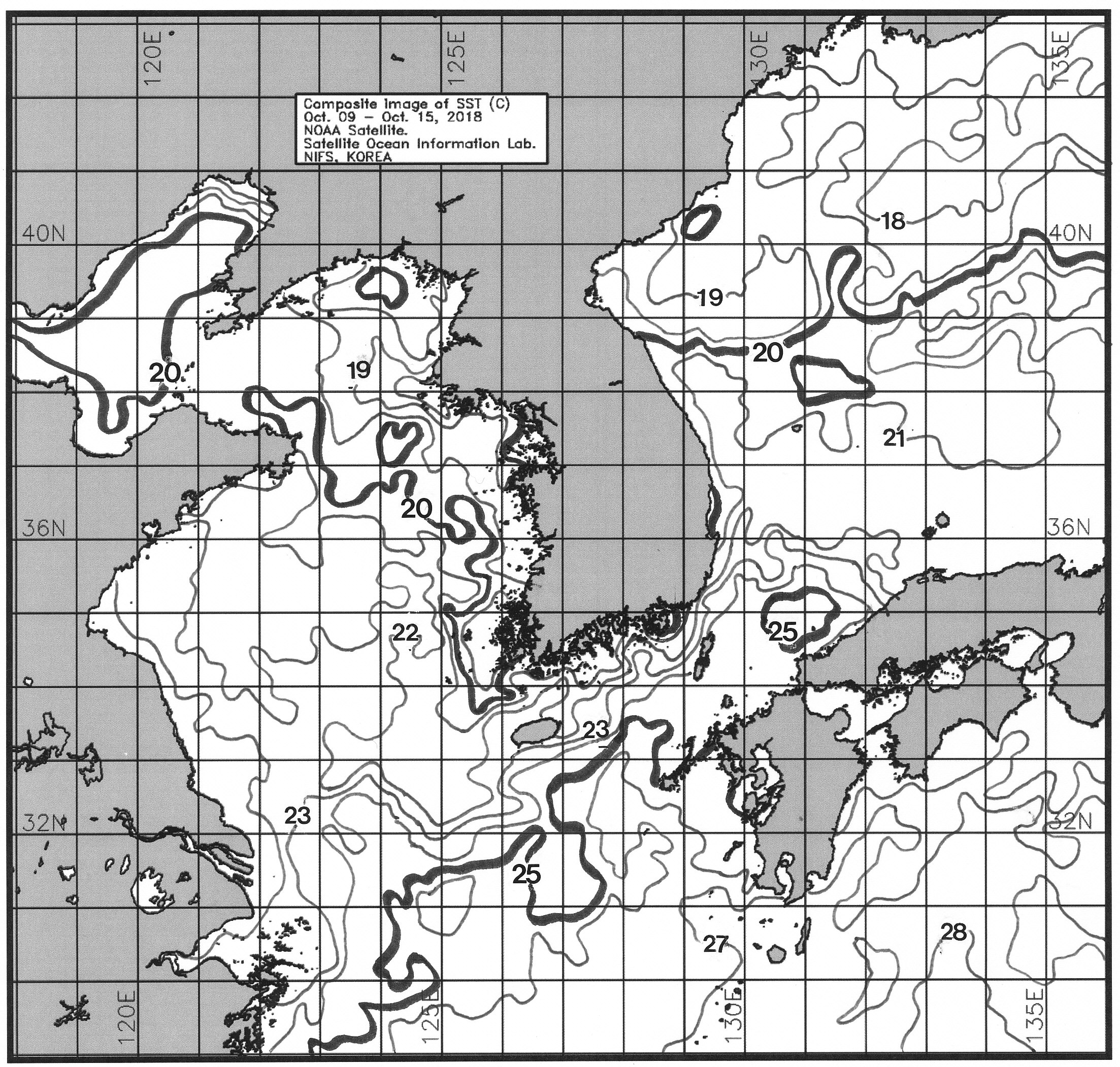 광역 위성영상 합성 표면수온 분포도 (2018. 10. 09 ~ 2018. 10. 15)