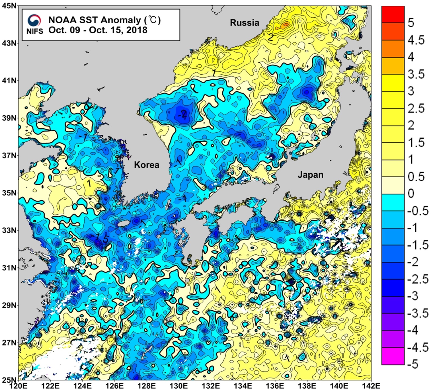 NOAA 위성영상 표면수온 평년편차 분포도 (2018. 10. 09 ~ 2018. 10. 15)