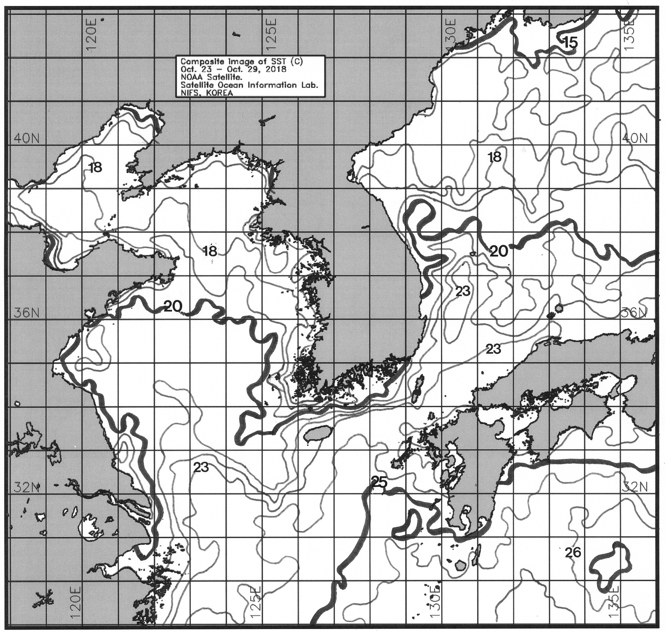 광역 위성영상 합성 표면수온 분포도 (2018. 10. 23 ~ 2018. 10. 29)
