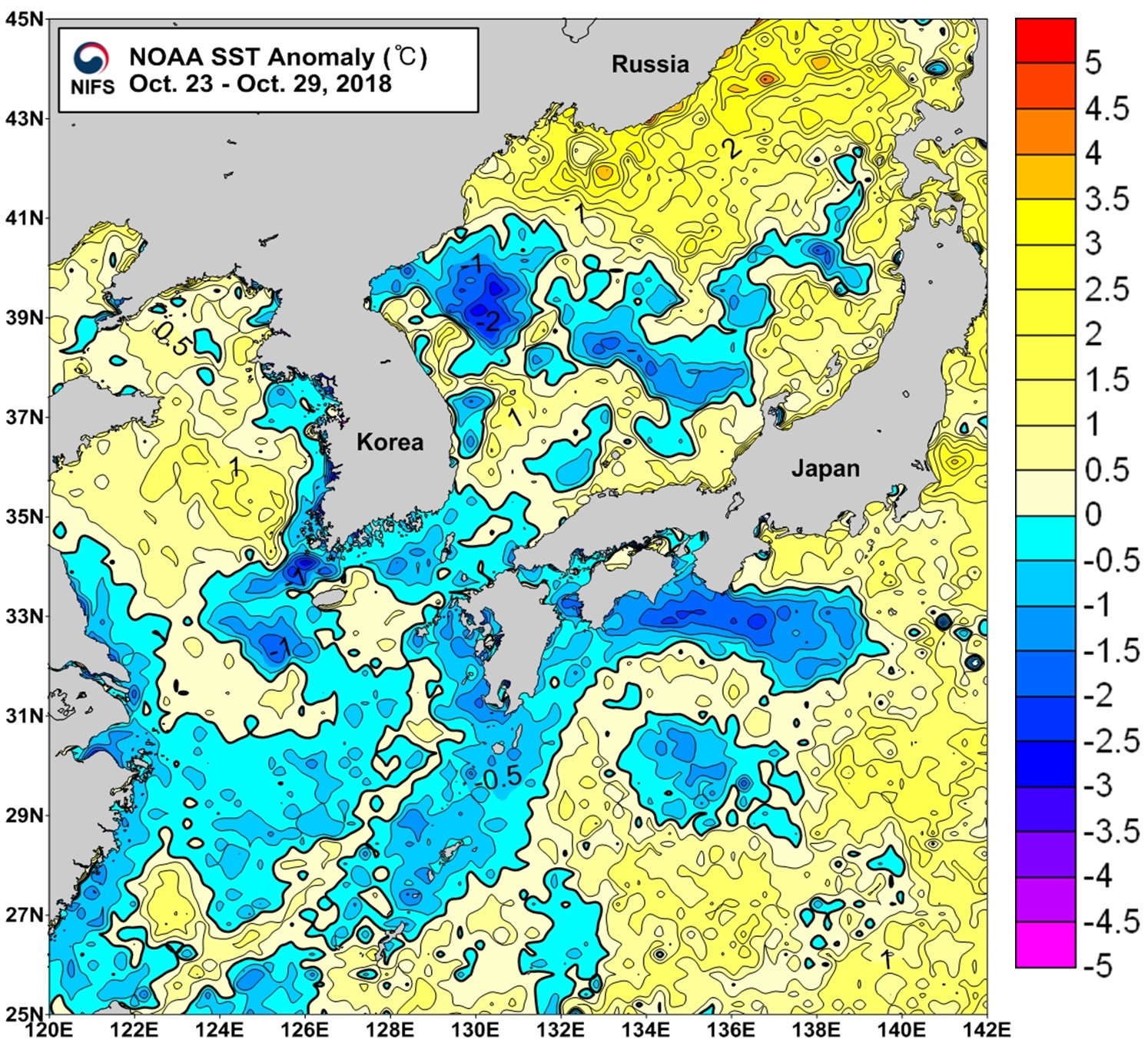 NOAA 위성영상 표면수온 평년편차 분포도 (2018. 10. 23 ~ 2018. 10. 29)
