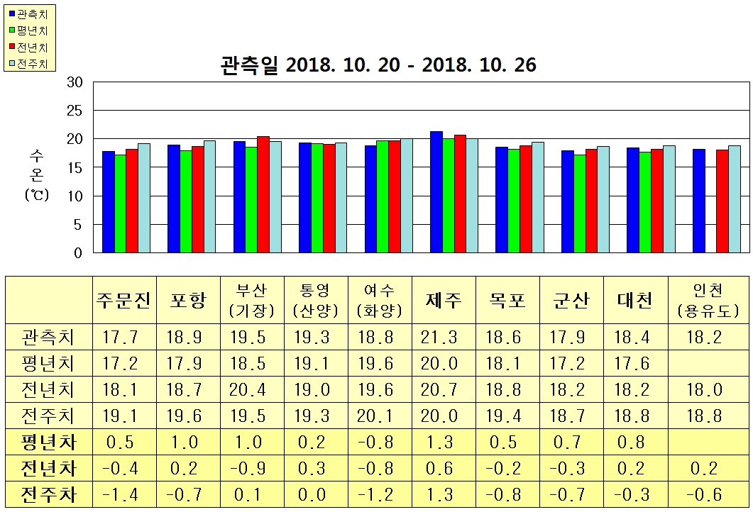 ○ 금주(2018.11.04.~2018.11.10)의 한반도 연안 표면수온은 동해 연안역에서 섭씨 16.5~17.0도, 남해 연안역에서 17.5~19.0도, 서해 연안역에서 16.5~17.0도 내외로 예상됩니다. ○ 평년에 비해 기장 비슷하게 나타나며 그 외 동해 연안역은 1.0~1.5도 높게, 통영 1.0~1.5도 높게 나타나며 그 외 남해 연안역은 비슷하게, 서해 연안역은 1.0~2.5도 높게 나타날 것으로 예상됩니다. ○ 전년에 비해 포항 비슷하게 나타나며 그 외 동해 연안역은 1~2도 낮게, 제주 0.5~1.0도 낮게 나타나며 그 외 남해 연안역은 비슷하게, 서해 연안역은 0.5~4.5도 높게 나타날 것으로 예상됩니다.