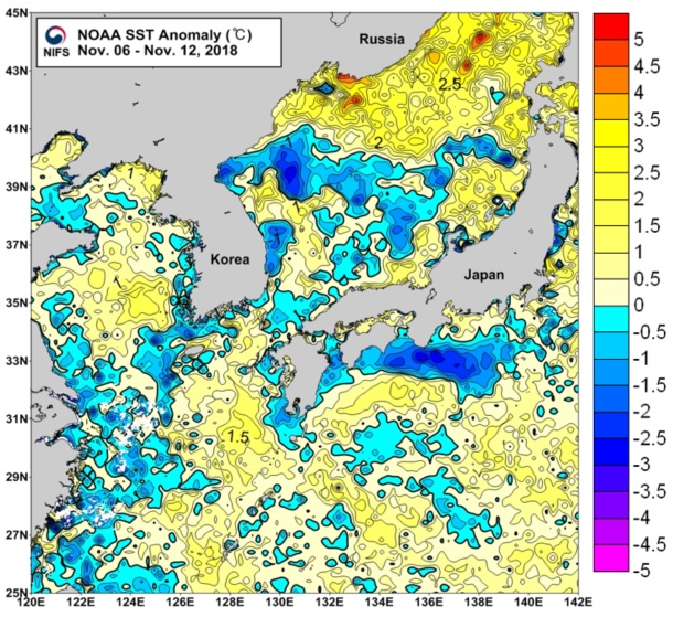 NOAA 위성영상 표면수온 평년편차 분포도 (2018. 11. 06 ~ 2018. 11. 12)