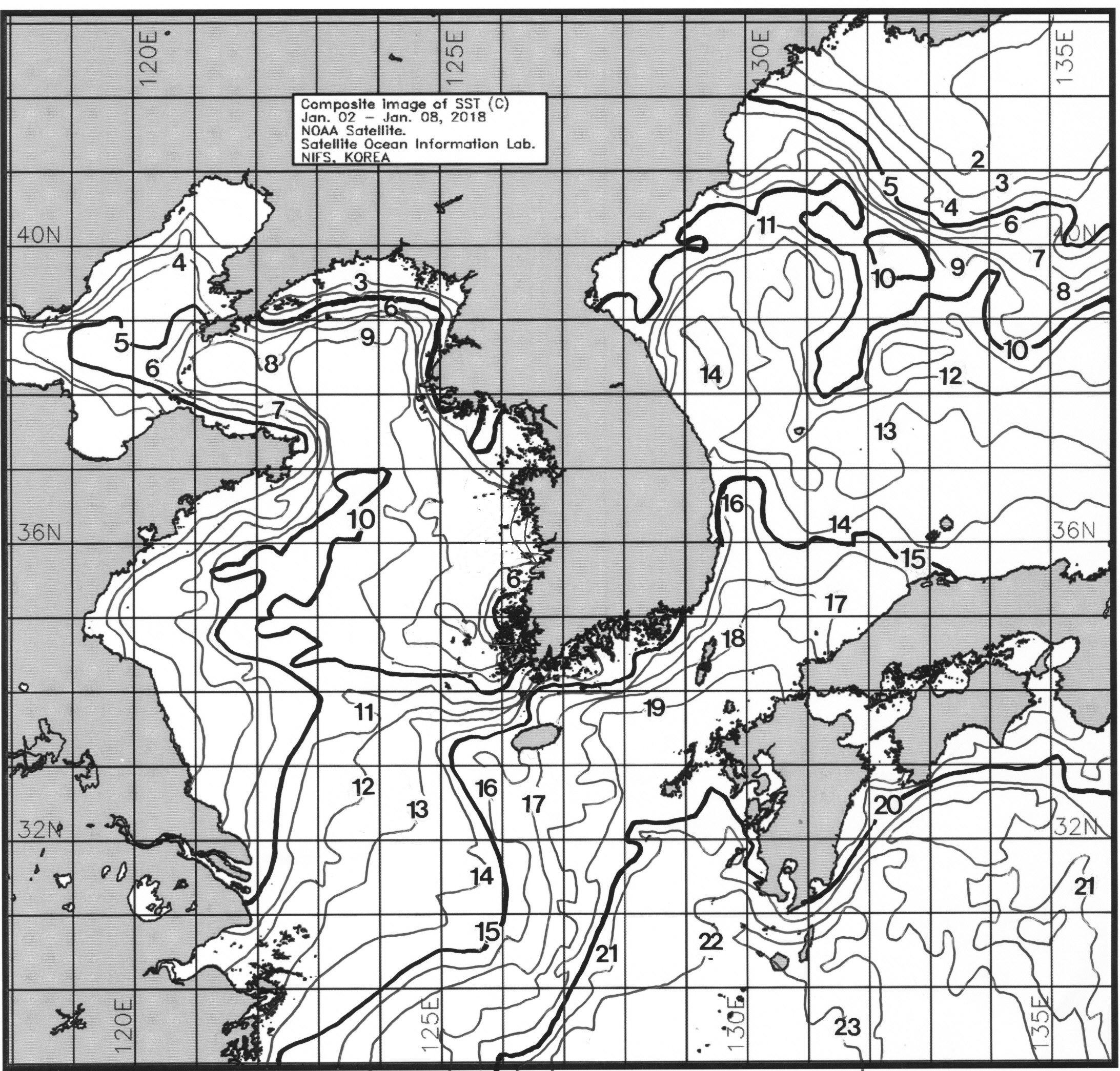 광역 위성영상 합성 표면수온 분포도 (2018. 01. 02 ~ 2018. 01. 08)
