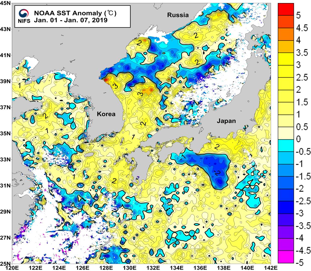 NOAA 위성영상 표면수온 평년편차 분포도 (2019. 01. 01 ~ 2019. 01. 07)
